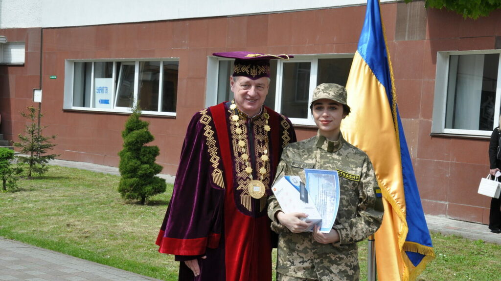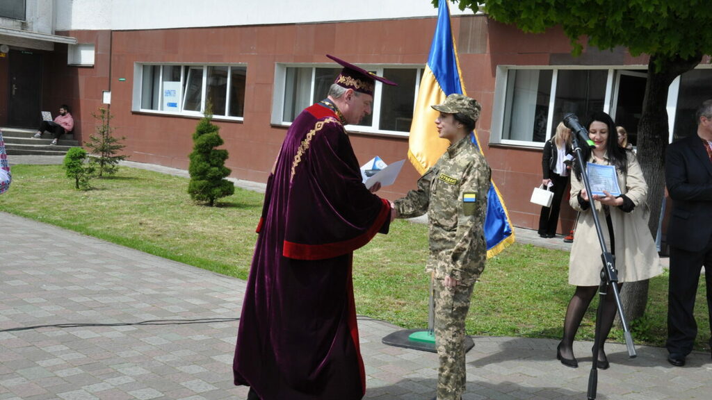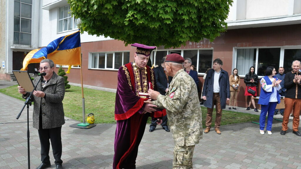 Від імені воїнів, які перебувають на Бахмутському напрямку, полковник десантно-штурмових військ, учасник бойових дій Микола Пантелюк у свою чергу привітав університет та нагородив почесною відзнакою українського козацтва, а саме орденом «Патріот України» та медаллю «За вірність українському народу» ректора ПНУ Ігоря Цепенду.